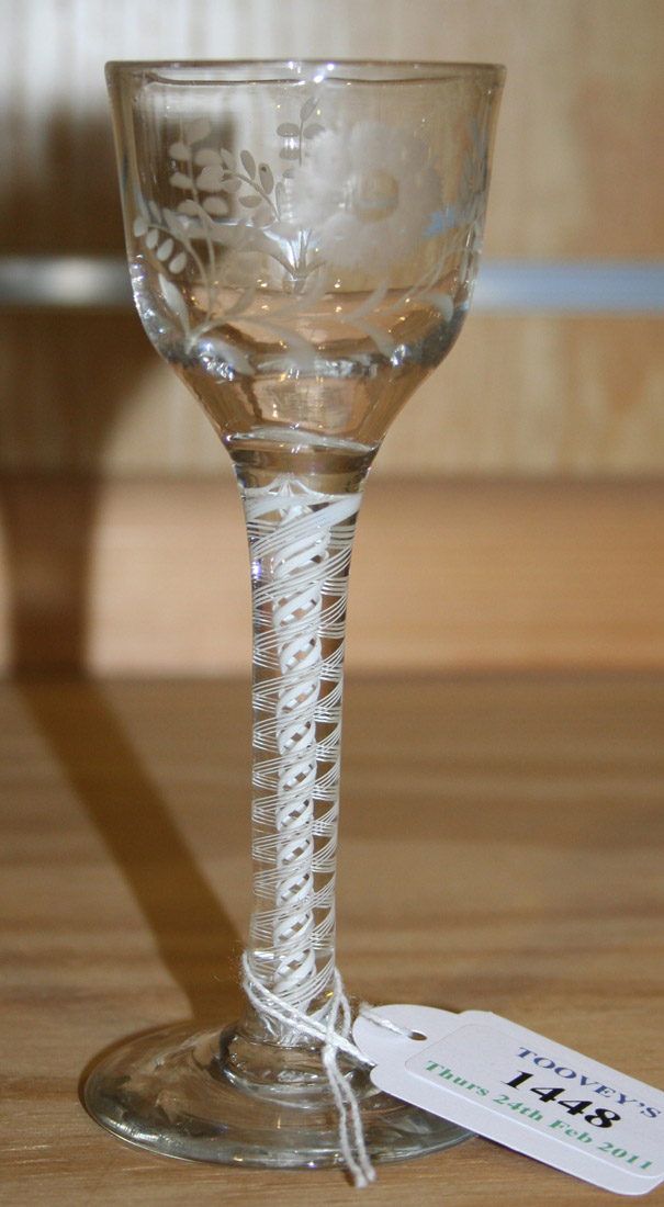 A double series opaque twist stem drinking glass, circa 1770, the ogee bowl engraved with an open flower on a leafy branch and a foliate sprig, on a plain stem with a pair of four ply spiral bands outside spiral tapes on a conical foot.