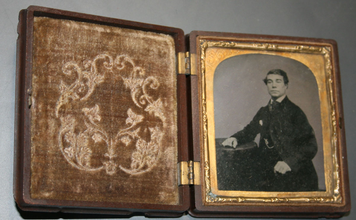 A 19th Century ambrotype portrait photograph of a seated gentleman within a gilt metal surround, held within a Union case, relief moulded with fruit (minor chips).