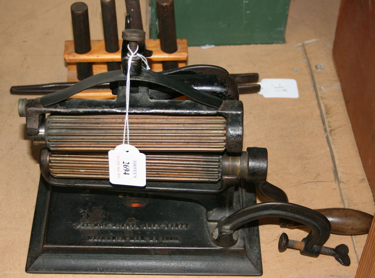 A Victorian Crown cast iron and brass table top collar and cuff mangle, together with four heating irons and a pair of tongs.