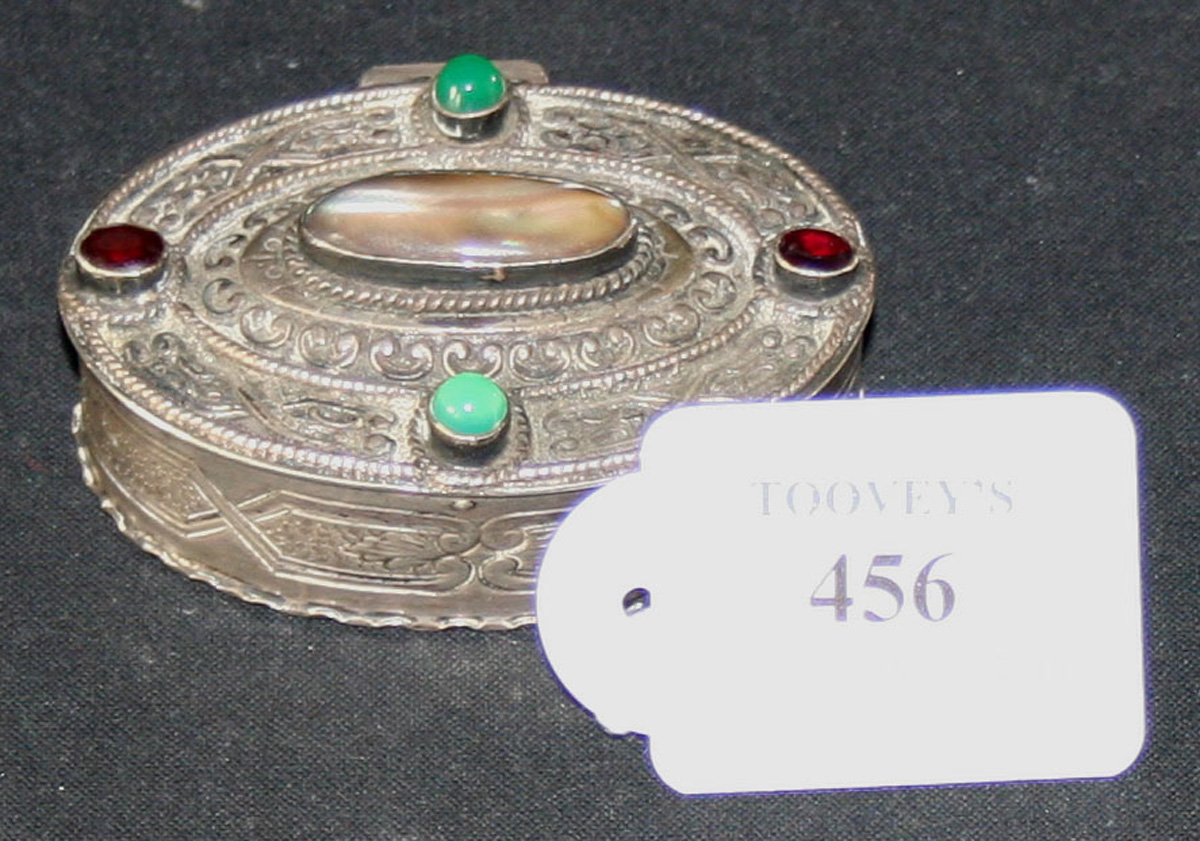A German .800 silver oval box, the hinge lid set with green and red paste cabochons within embossed scroll and strapwork borders framing an abalone centre, length approx 7cm.