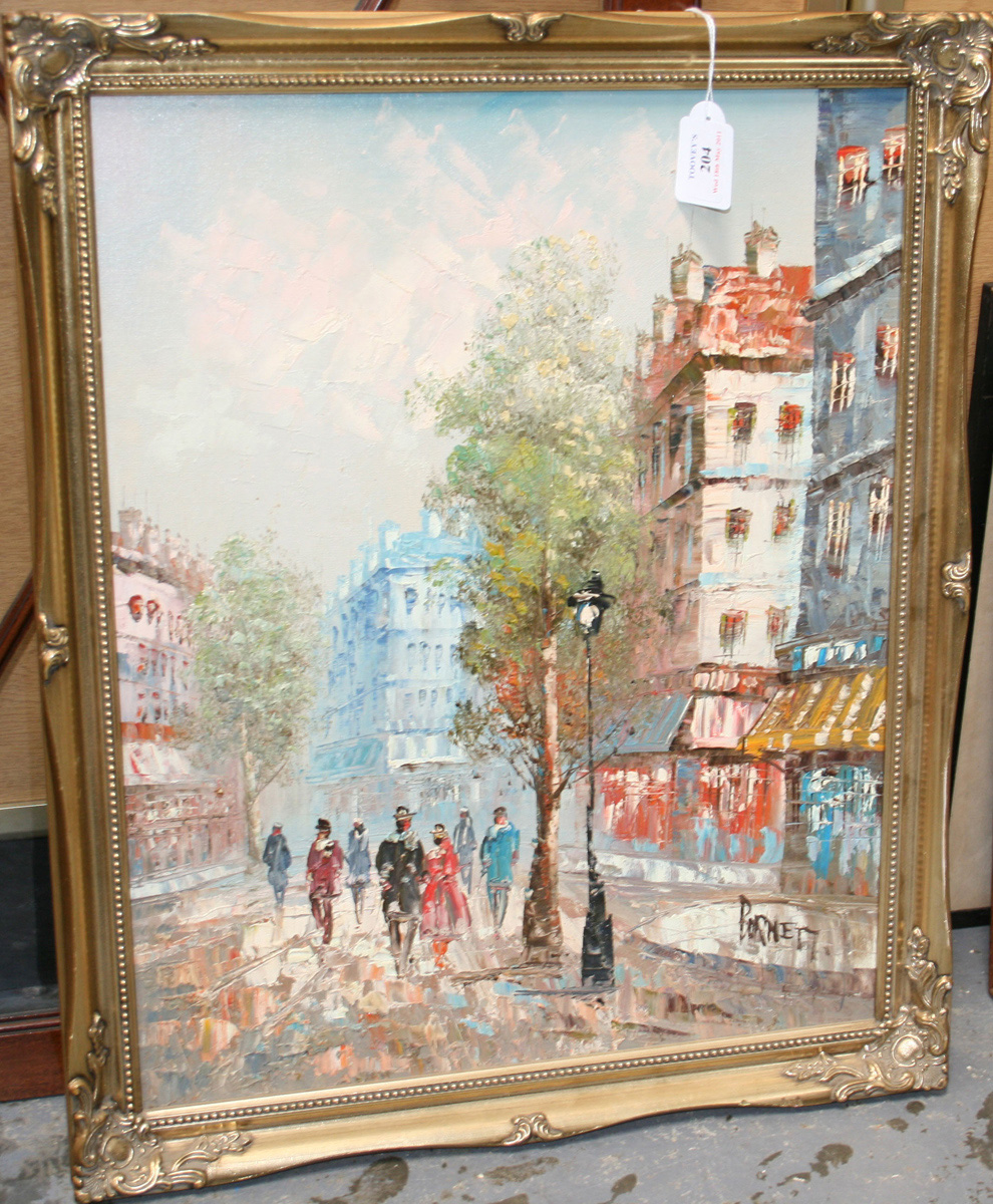 Burnett - Parisian Street Scene, 20th Century oil on canvas board, signed, within a gilt frame.