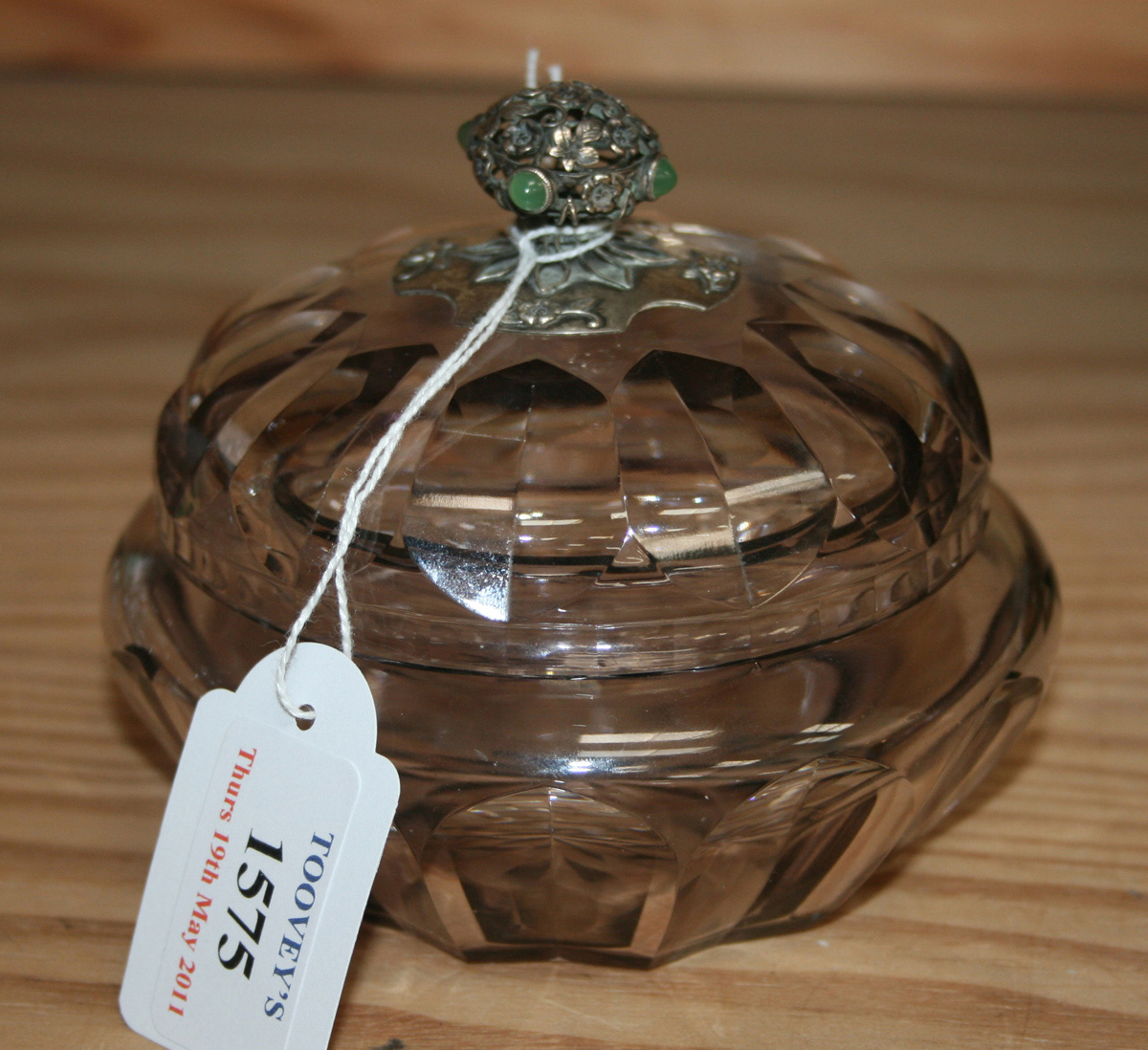 A pale amethyst tinted cut glass bowl and cover, early 20th Century, the circular body cut with arched facets, the cover with silver knop formed as a pierced foliate and wirework sphere mounted with green cabochons, the underside of the cover with silver foliate medallion, the base of the glass marked 'O/H.A. 5326', diameter approx 11.5cm.