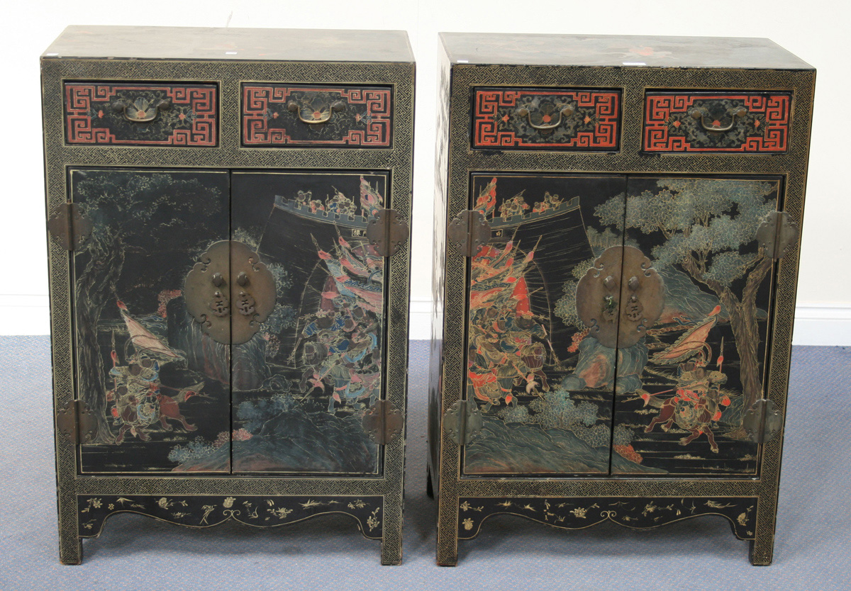 A pair of 20th Century Chinese lacquer cabinets, decorated with figures within landscapes on a black ground, each fitted with two short drawers and a double cupboard above a shaped apron, raised on block legs, widths approx 63cm.