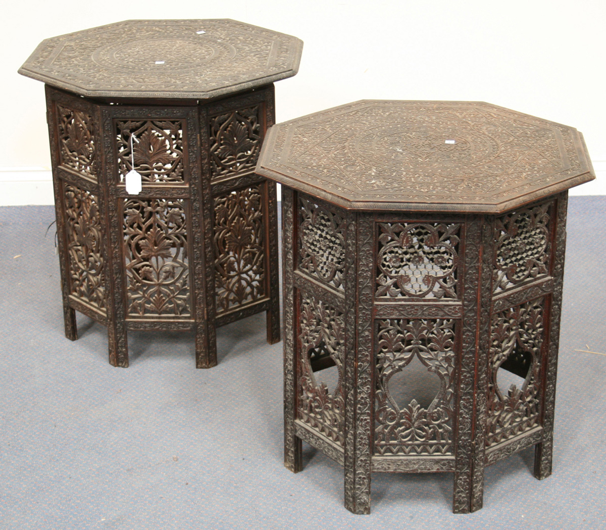 A matched pair of 19th Century Indian hardwood octagonal occasional tables, profusely carved with trailing vines and flowering branches, each folding base with pierced panels, widths approx 61cm.