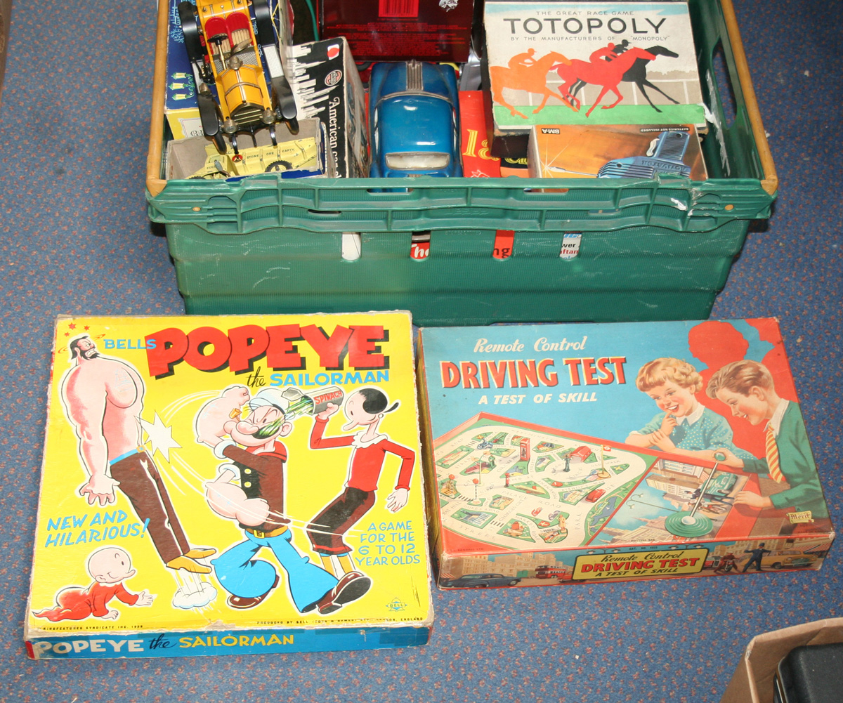 A Shuco No. 1225 clockwork Oldtimer Mercer type 35J car, boxed, with key, a Dinky Supertoys No. 965 Euclid dump truck, and a small collection of other toys and games.