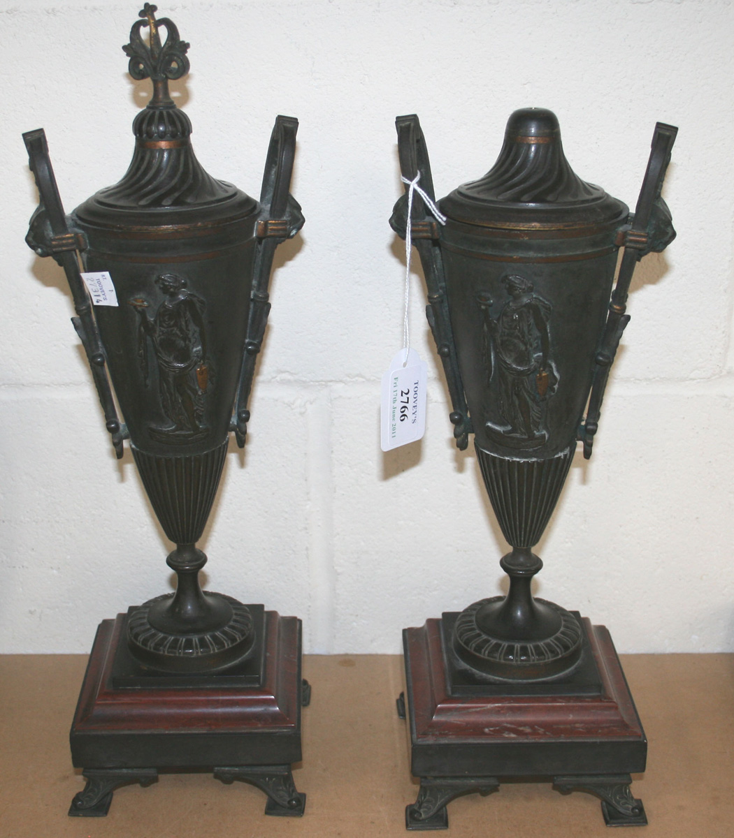 A pair of late 19th Century Neoclassical style brown patinated cast bronze urns and covers, each with grotesque mask handles flanking an elongated ovoid body, relief decorated with classical maidens, on rouge marble and black bases and scroll feet (faults).