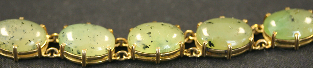 A gold mounted oval pale green stone bracelet, claw set with a row of oval cut cabochon pale green gem stones, on a snap clasp, detailed '9ct'.