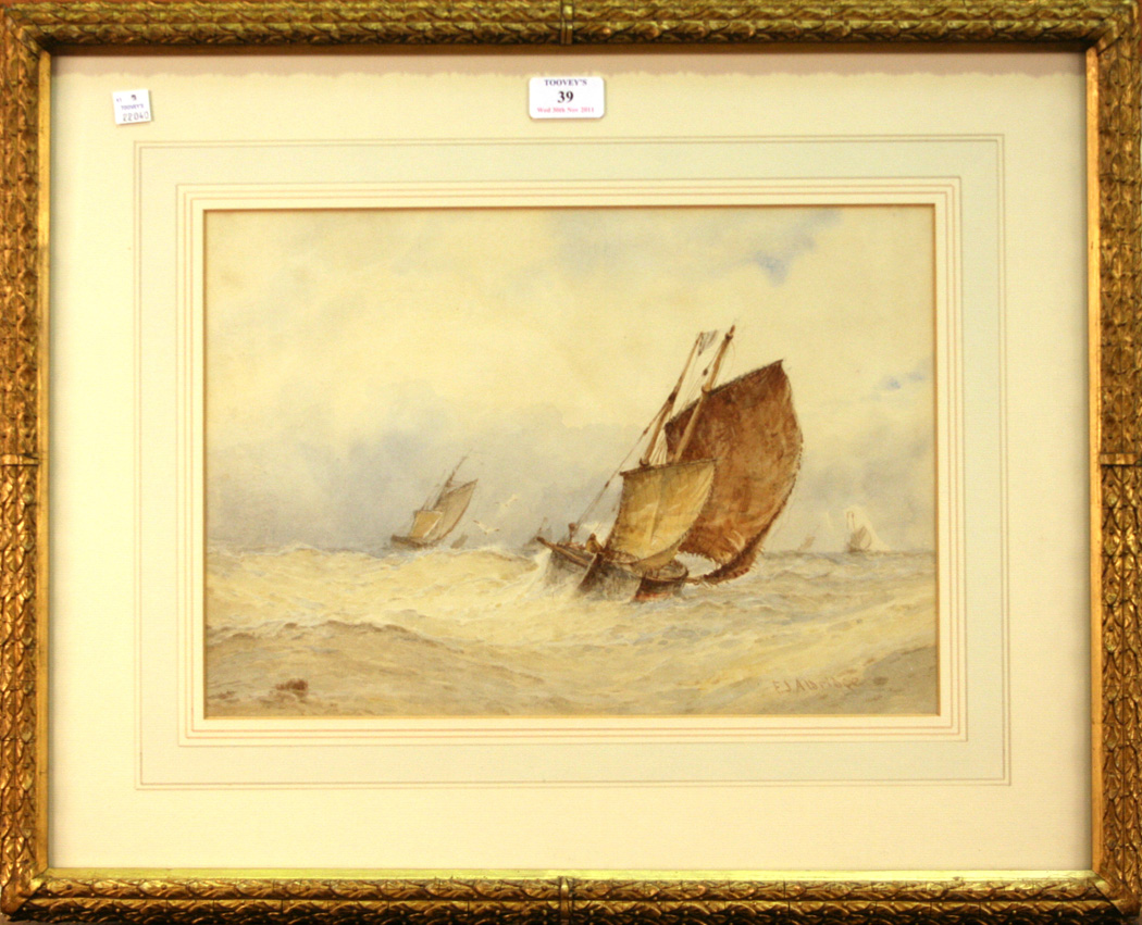 F.J. Aldridge - Study of Fishing Boats on Choppy Waters, watercolour, signed, approx 26cm x 37.5cm, within a gilt composition frame with stiff leaf and berry moulding.