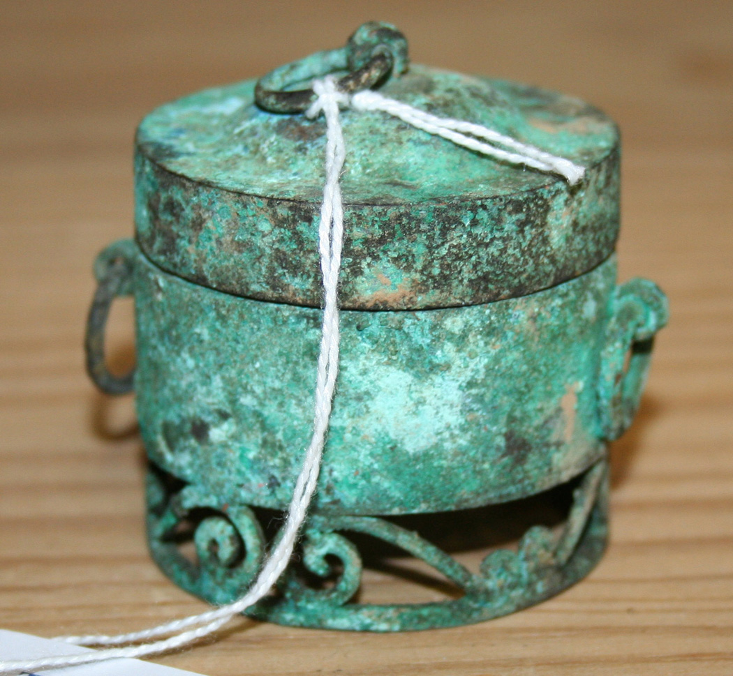 A Chinese archaistic miniature bronze cosmetic box and cover, possibly Han dynasty, of cylindrical form with openwork stand, all covered in verdigris, height approx 5.7cm.
