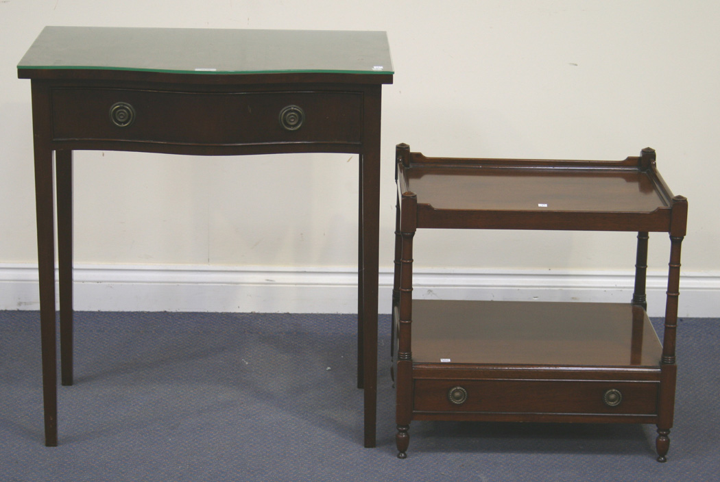 A 20th Century reproduction mahogany side table fitted with a single drawer, on square tapering legs, together with a two tier table.