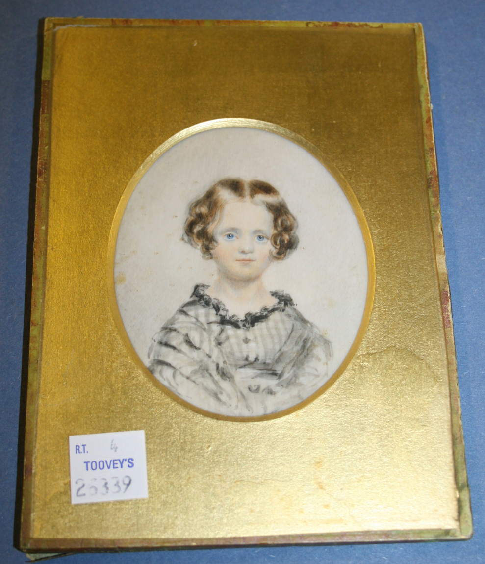 Mary de Castro - Oval Miniature Half Length Portrait of Frances Sophie Morris, 19th Century watercolour on ivory, inscribed and lock of hair attached verso, approx 8cm x 7cm, within a gilt mount.
