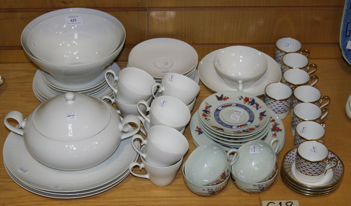 A Rosenthal Studio-Linie white glazed part service, relief decorated with concentric bands of ovals, comprising three plates, two bowls of graduated size, a tureen and cover, saucer dish, three tea plates, four side plates, eight teacups and seven saucers and a soup bowl and stand (minor faults and repairs), together with eight Ginori coffee cans and four saucers and a Chinese style Limoges part service (minor faults).