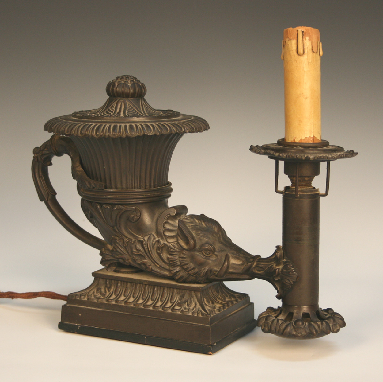 A 19th Century brown patinated cast bronze Argand type table lamp, the fluted cornucopia with boar's head base supporting an upright light holder, the stop fluted rectangular base on a wooden plinth, width approx 31cm.
