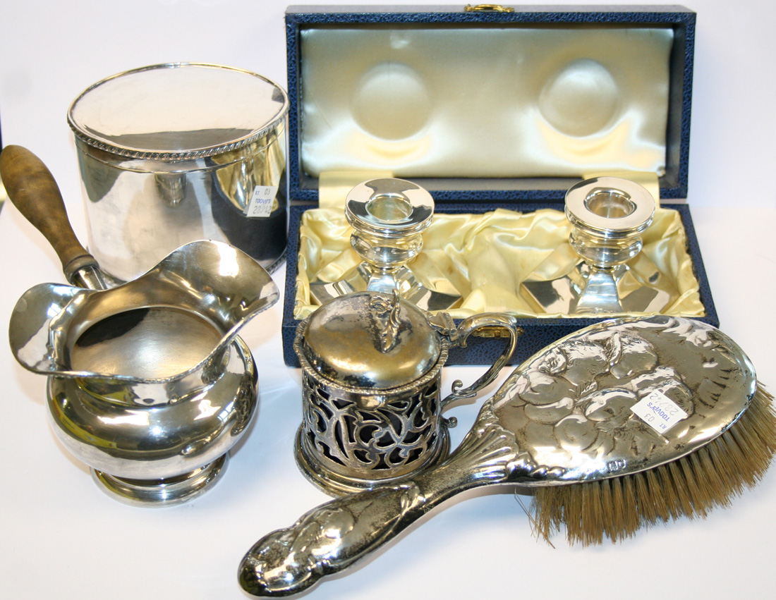 A pair of silver stub candlesticks with detachable nozzles above hexagonal bases, Birmingham 1971, cased, a silver three piece dressing table set, a silver spoon and fork set, a plated oval caddy, mustard and a sauce boat.