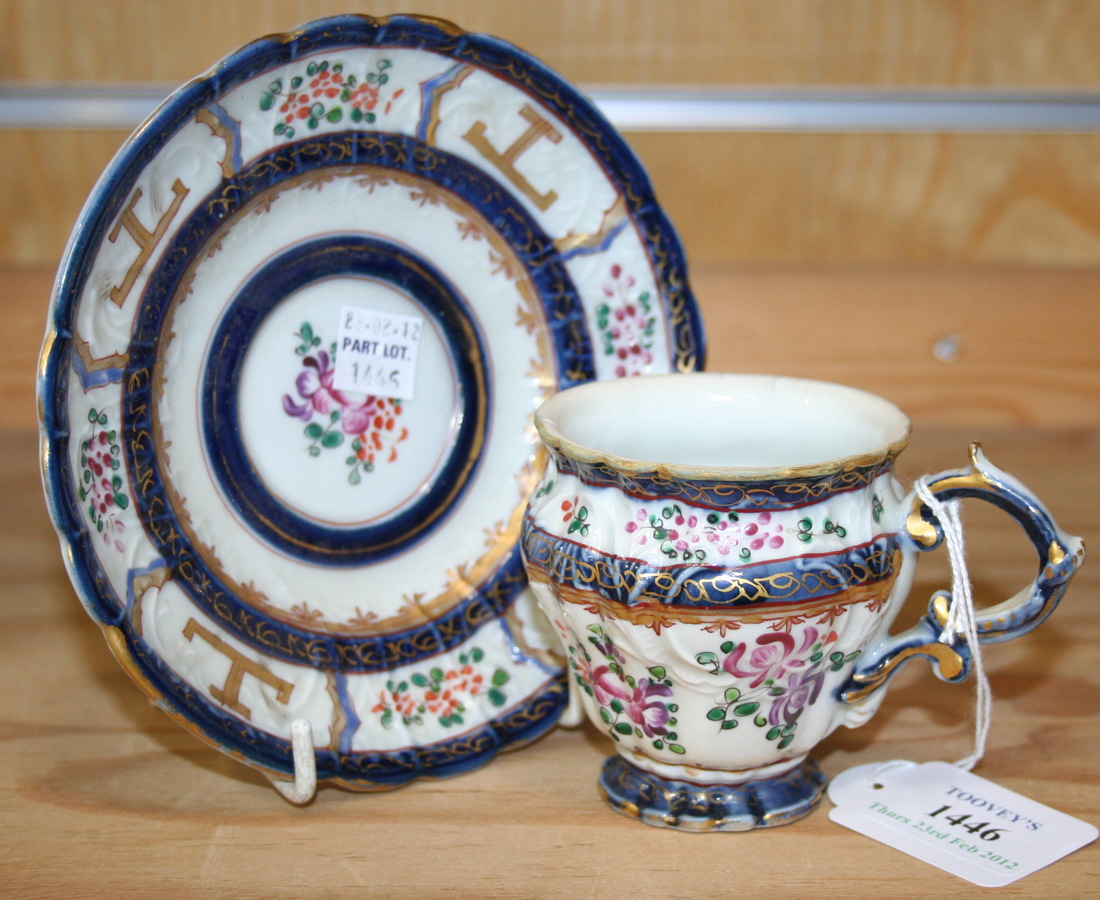 A Samson porcelain teacup and saucer, late 19th Century, enamelled with famille rose style flowers within blue and gilt banding and relief moulded scrolls, red painted factory marks, together with a Royal Worcester coffee cup and saucer and a Royal Worcester small jardinière (restored).