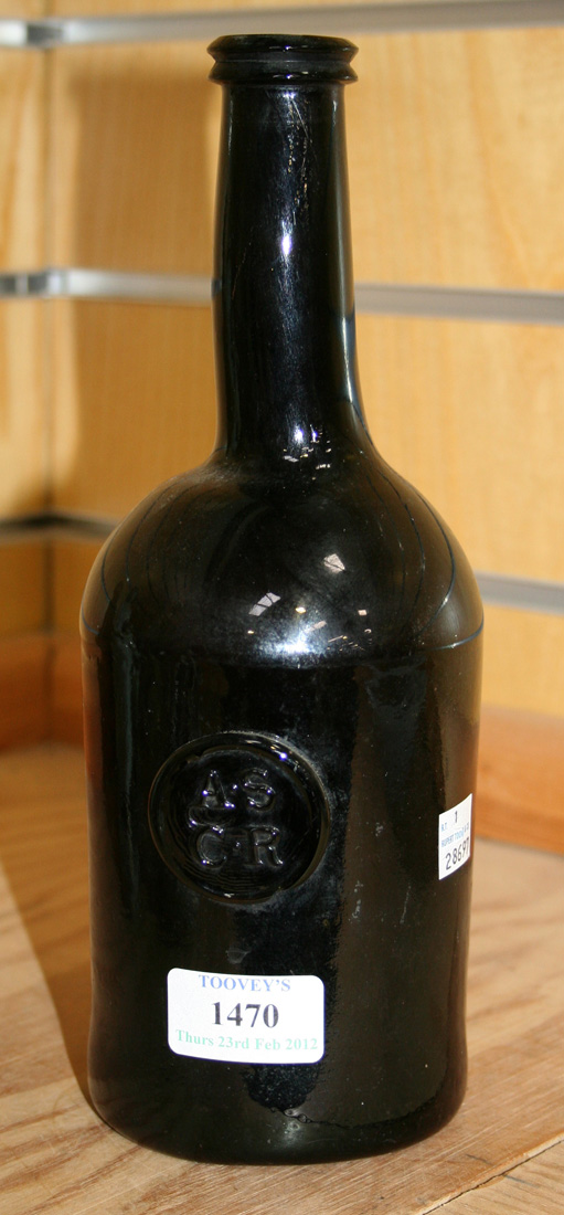 A dark green olive tinted glass wine bottle, late 18th/early 19th Century, with circular 'A.S.C.R' seal for All Souls Common Room, with kick in base and gadrooned rim, height approx 26cm.