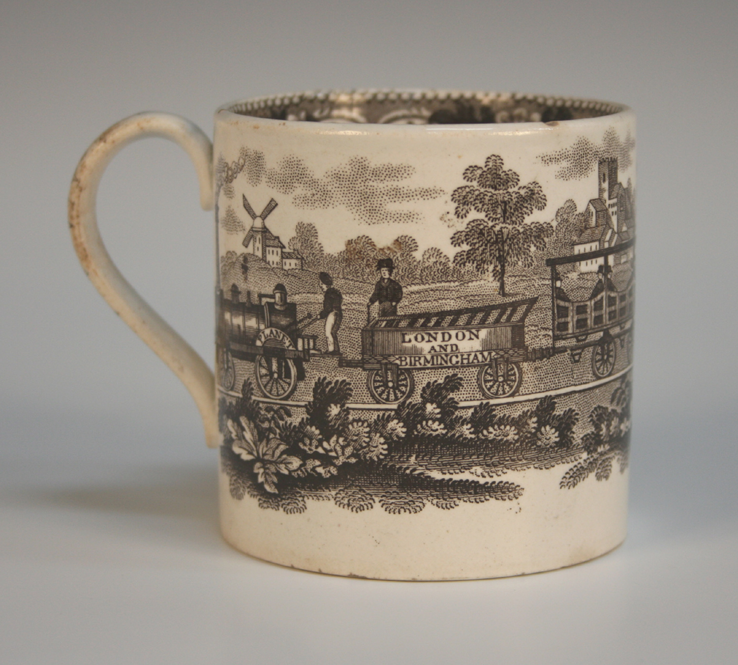 A pearlware London and Birmingham railway commemorative mug, circa 1838, printed in dark brown with a locomotive named 'Planet' and tender pulling three coaches, height approx 7.2cm.