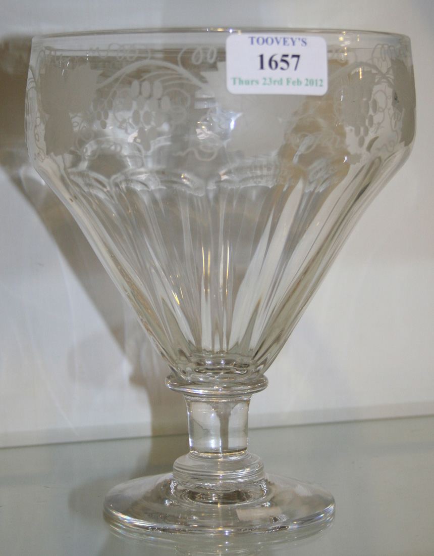 An oversized glass rummer, 19th Century, engraved with a band of fruiting vine, on a circular foot.