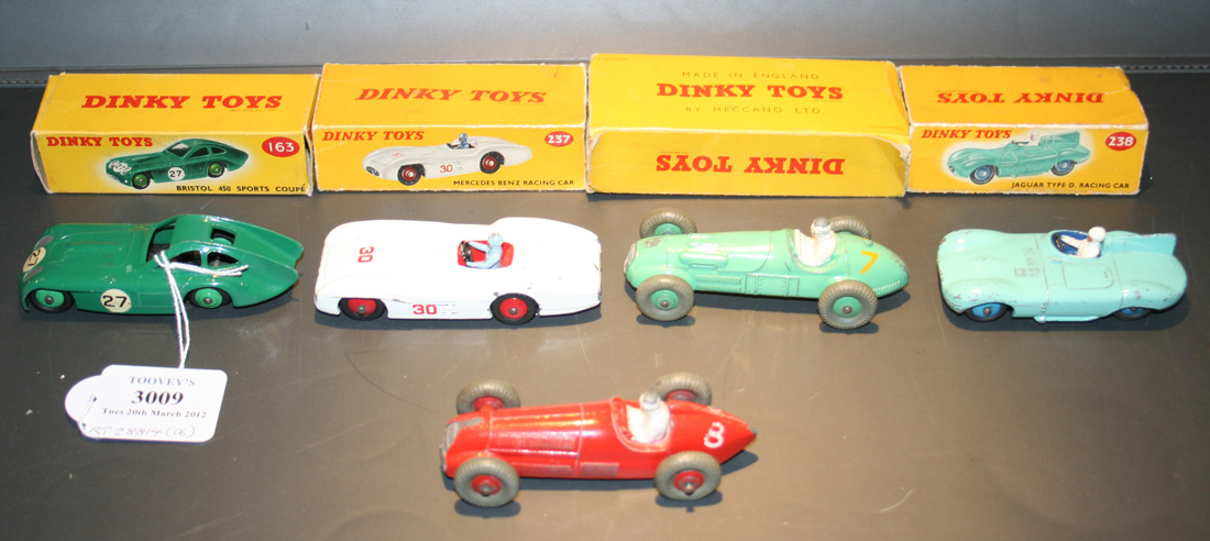 A small collection of Dinky Toys racing cars, comprising a No. 163 Bristol 450 sports coupé, a No. 237 Mercedes-Benz racing car and a No. 238 Jaguar D type racing car, all boxed (some playwear and paint chips, boxes creased and scuffed, two missing end flaps and tabs), together with a No. 23f Alfa Romeo, a No. 23j HWM (paint chips) and a Dinky Toys box (missing end flaps and tabs).