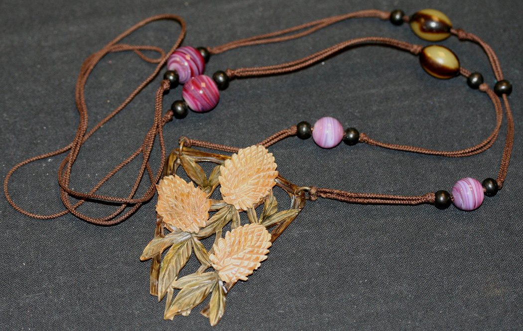 A carved and stained horn pendant necklace, detailed 'Bonte', in a floral and foliate design, the brown cord suspension spaced with vari-coloured mostly mauve glass beads at intervals (faults).