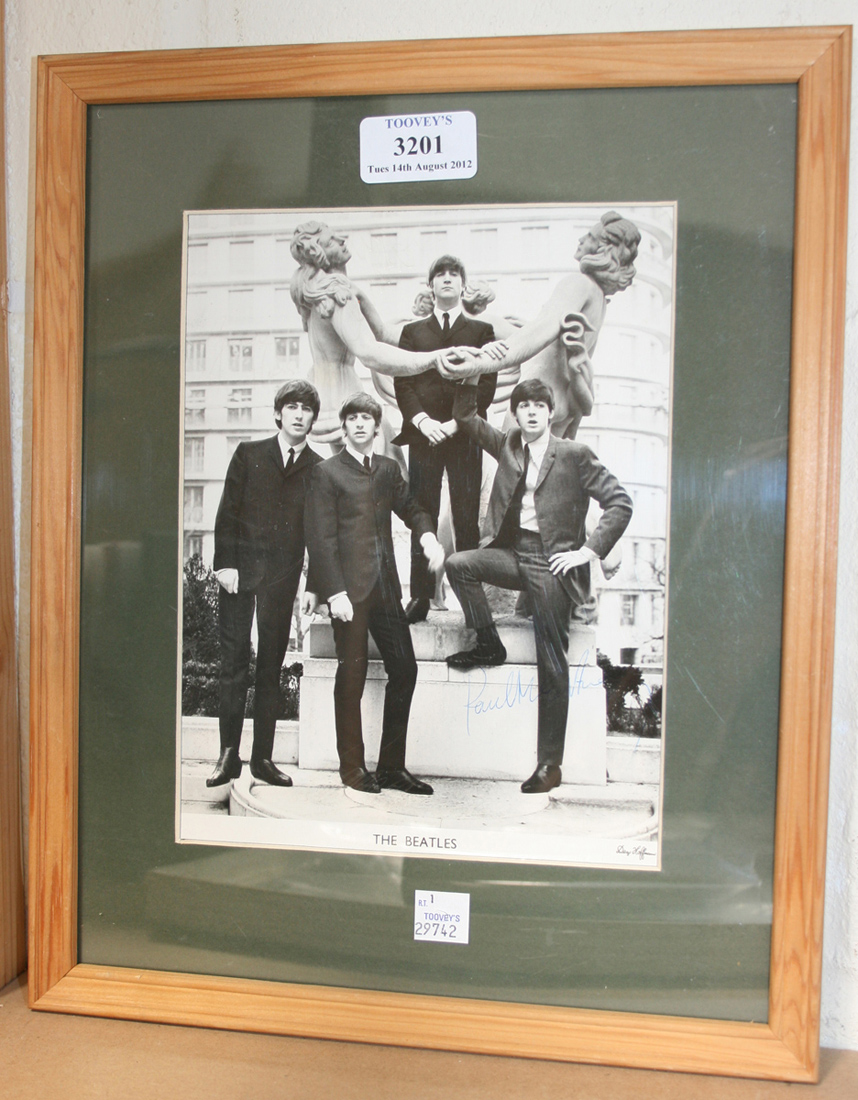 THE BEATLES. An autographed press photograph, [n.d.] (215 x 162mm.) Signed by all four members of the band. (Three signatures faded and visible by impression only, slight browning.) Framed and glazed. Provenance: purchased by the vendor from Toovey's (Lot 3147 from sale on 18th May 2010); purchased by the original vendor from Christie's (Lot 41 from sale on 14 May 1993).