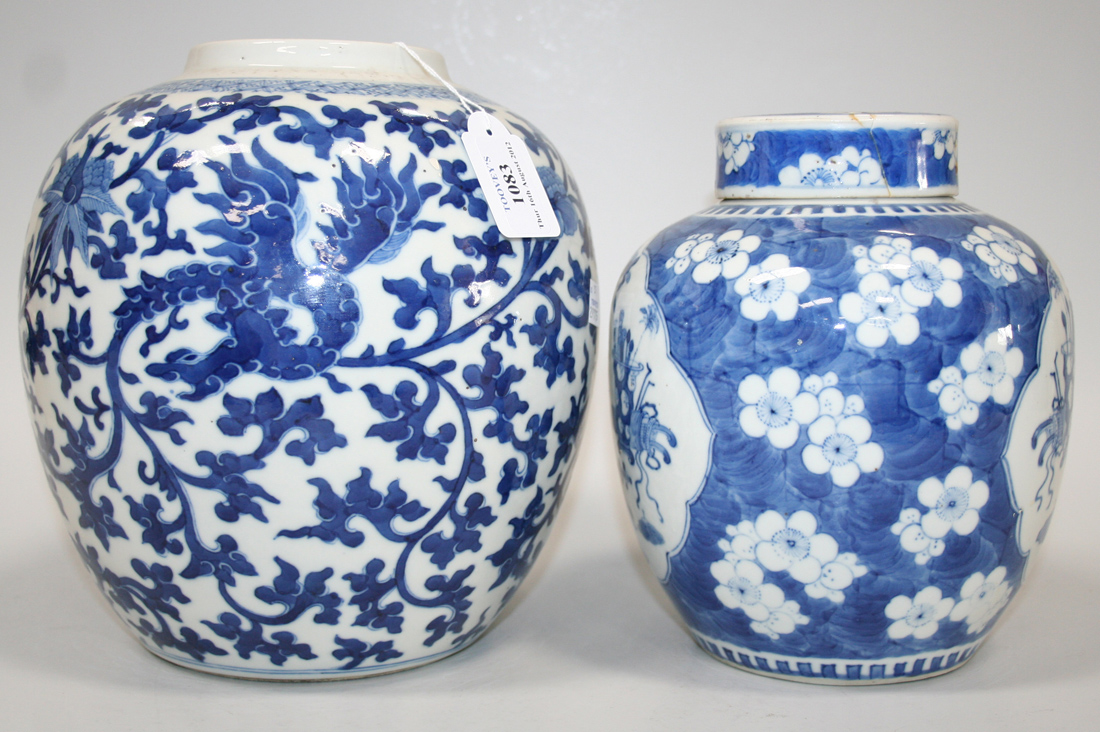 A Chinese blue and white porcelain ginger jar, mark of Kangxi but late 19th Century, painted with a dense lotus and tendril design, pseudo underglaze blue six character mark to base, height approx 23cm, together with a Chinese blue and white ginger jar and cover, late 19th Century, painted with precious vessels and objects against a prunus ground, height approx 21cm (cover repaired).