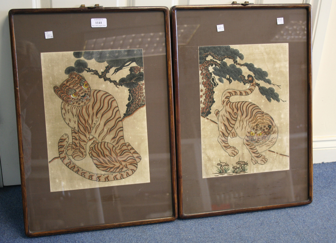 A set of four Korean printed and coloured pictures of tigers, 20th Century, each depicting a tiger in a different pose, approx 34cm x 25.5cm, framed and glazed.