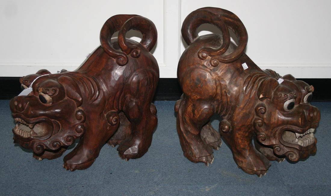 A pair of South East Asian carved hardwood figures of Buddhistic lions, late 20th Century, height approx 44cm.