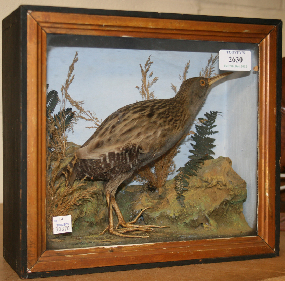 A late Victorian taxidermized water rail, mounted in a naturalistic setting within a glazed display case, height approx 26cm.