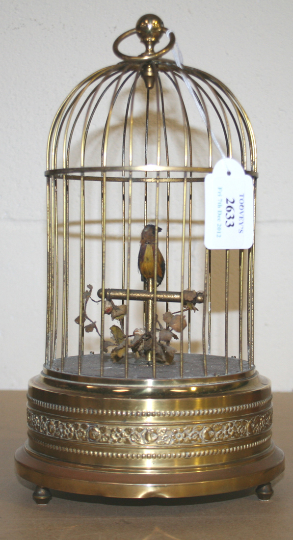 A 20th Century brass musical bird automaton birdcage, the moving and singing bird within a wire cage, the circular base cast with a band of flowers, on turned feet, height approx 28cm.