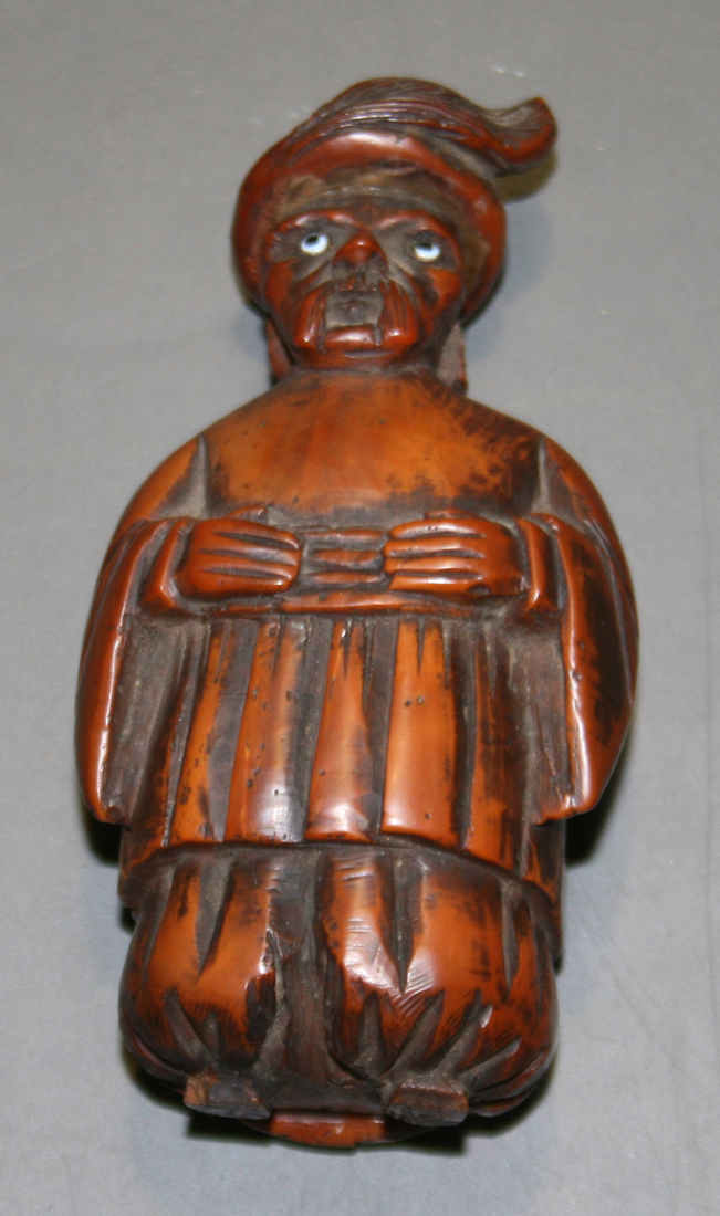 An 18th Century carved coquilla nut snuff box in the form of a European gentleman wearing a feathered hat.