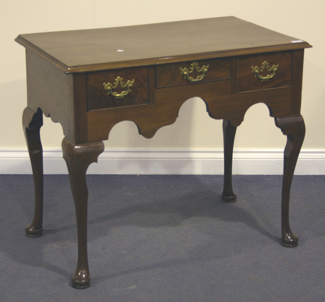 An 18th Century walnut lowboy, the moulded top above three frieze drawers and a shaped apron, on cabriole legs and pad feet, width approx 88cm (alterations and restoration).