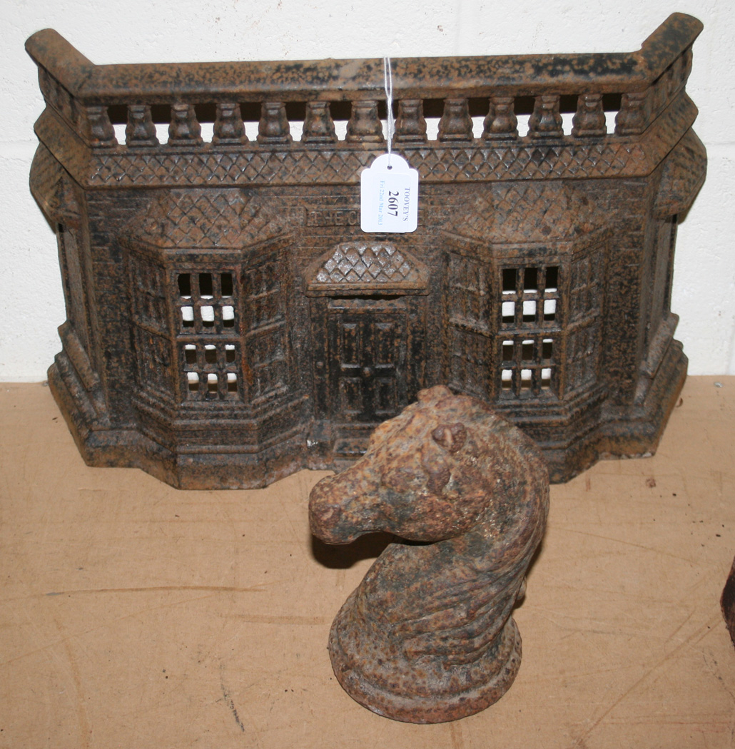 A Victorian cast iron fire grate front in the form of a cottage façade, the balustrade top above pierced windows and a front door, cast with 'The Cottage' and bearing lozenge mark to back, width approx 42cm, together with a cast iron model of a horse's head.