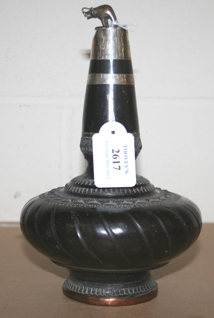A 19th Century Indian carved black stoneware bottle vase with white metal and plated mounts, the lid with an elephant finial above a banded neck and bulbous body, height approx 23cm (restoration).