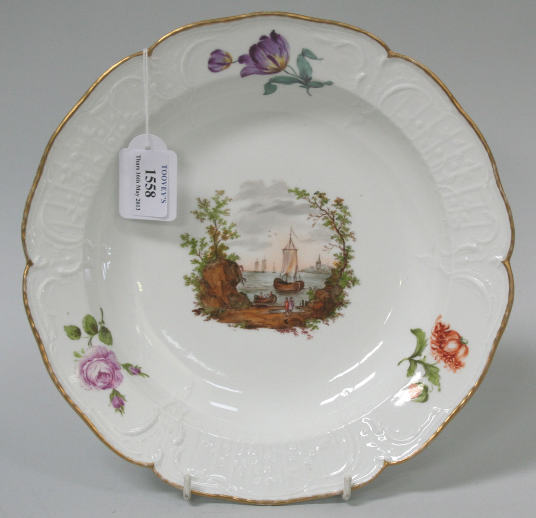 A Berlin porcelain circular dish, 19th Century, painted to the centre with a figural harbourside scene, the gilt edged rim moulded in low relief with blossom branches and scrollwork framing three enamelled floral sprigs, underglaze blue sceptre mark to base, diameter approx 27cm.