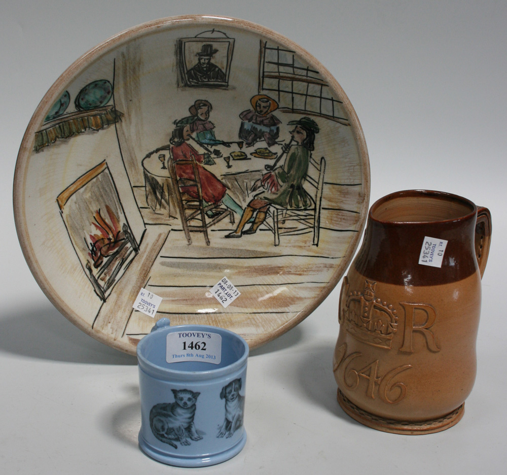 A blue glazed child's mug, mid-19th Century, transfer printed with a seated cat and dog, a Glynn College circular bowl painted with an interior scene with figures seated at a table, and a Doulton stoneware brown glazed jug, impressed 'Phillips, Oxford St, London' to base.