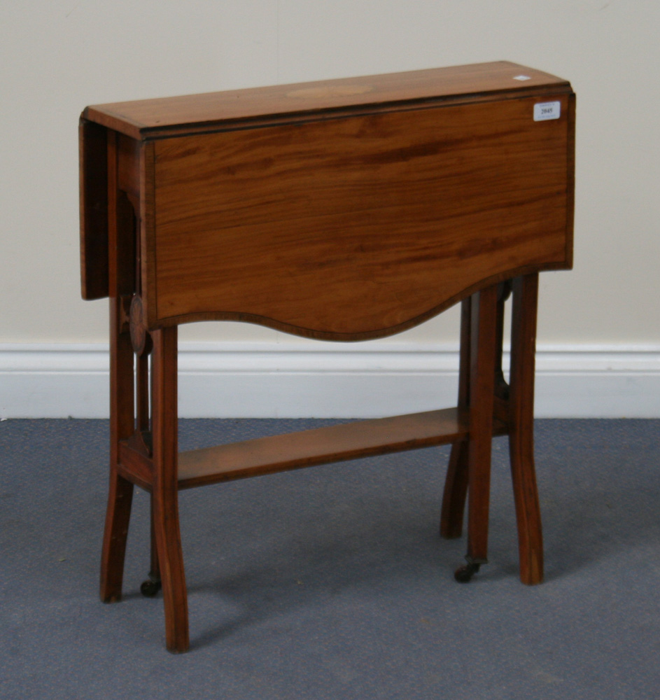 An Edwardian satinwood Sutherland table, the top inlaid with a central fan patera within crossbanded borders, on shaped block legs, width approx 60cm.