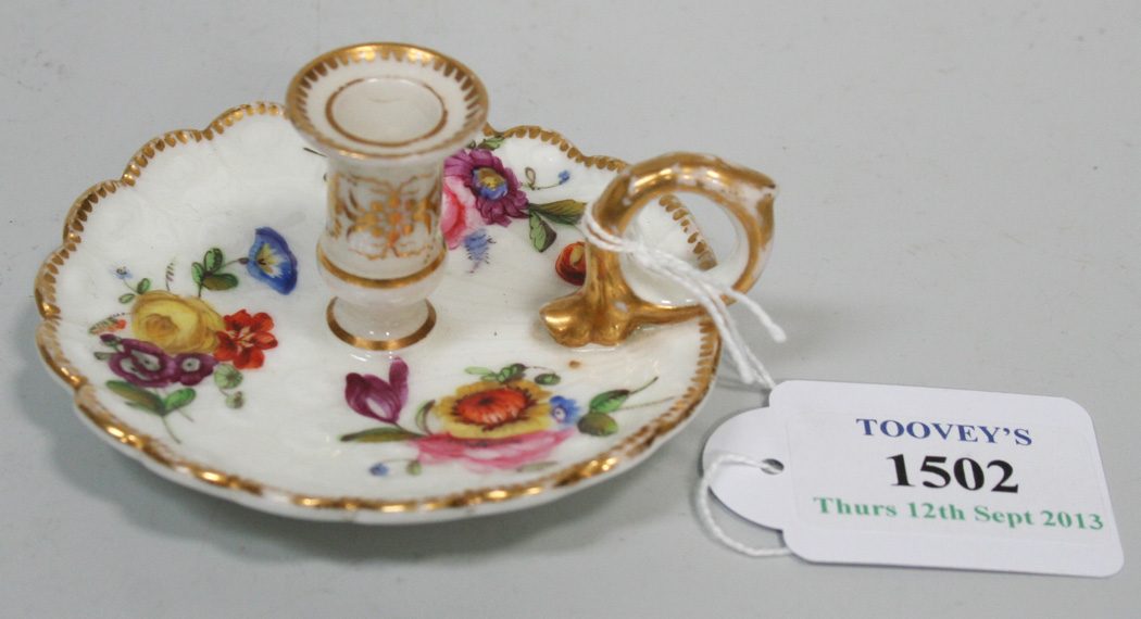 A Coalport Feltspar porcelain small chamberstick, circa 1820, the shell shaped base with feather moulded detail and scattered floral bouquets within the gilt dentil rim, surmounted by a gilt ring handle, puce printed Society of Arts factory mark to base, diameter approx 8.5cm.