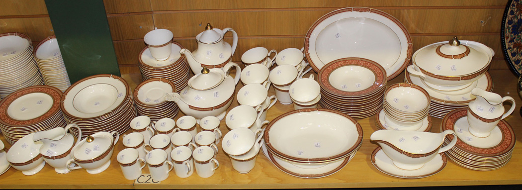 A Royal Doulton 'Meridian' pattern part service, comprising an oval tureen and cover, an oval platter, two oval dishes, sauce boat and stand, fourteen dinner plates, sixteen dessert plates, twenty side plates, twenty-four soup bowls, twenty-four breakfast bowls, eighteen dessert bowls, teapot and cover, seventeen teacups and saucers, coffee pot and cover, twelve coffee cans and saucers, sugar bowl and cover, milk jug, slop bowl, and cake plate, together with a collection of second quality 'Meridian' pattern, comprising tureen and cover, ten dinner plates, ten dessert plates, four side plates, six dessert bowls, sauce boat and stand, and a milk jug.