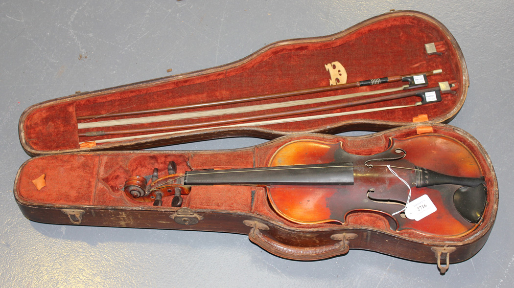 A late 19th/early 20th Century violin, bearing label to interior marked 'Antonius Stradiuarius...' with striped two-piece back, length of back excluding button 36cm, within a wooden case, with two bows.