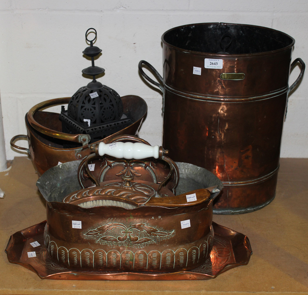An Art Nouveau copper tray, engraved with a scroll band, together with a copper kettle, a Dutch copper oval jardinière and a small collection of metalwork.