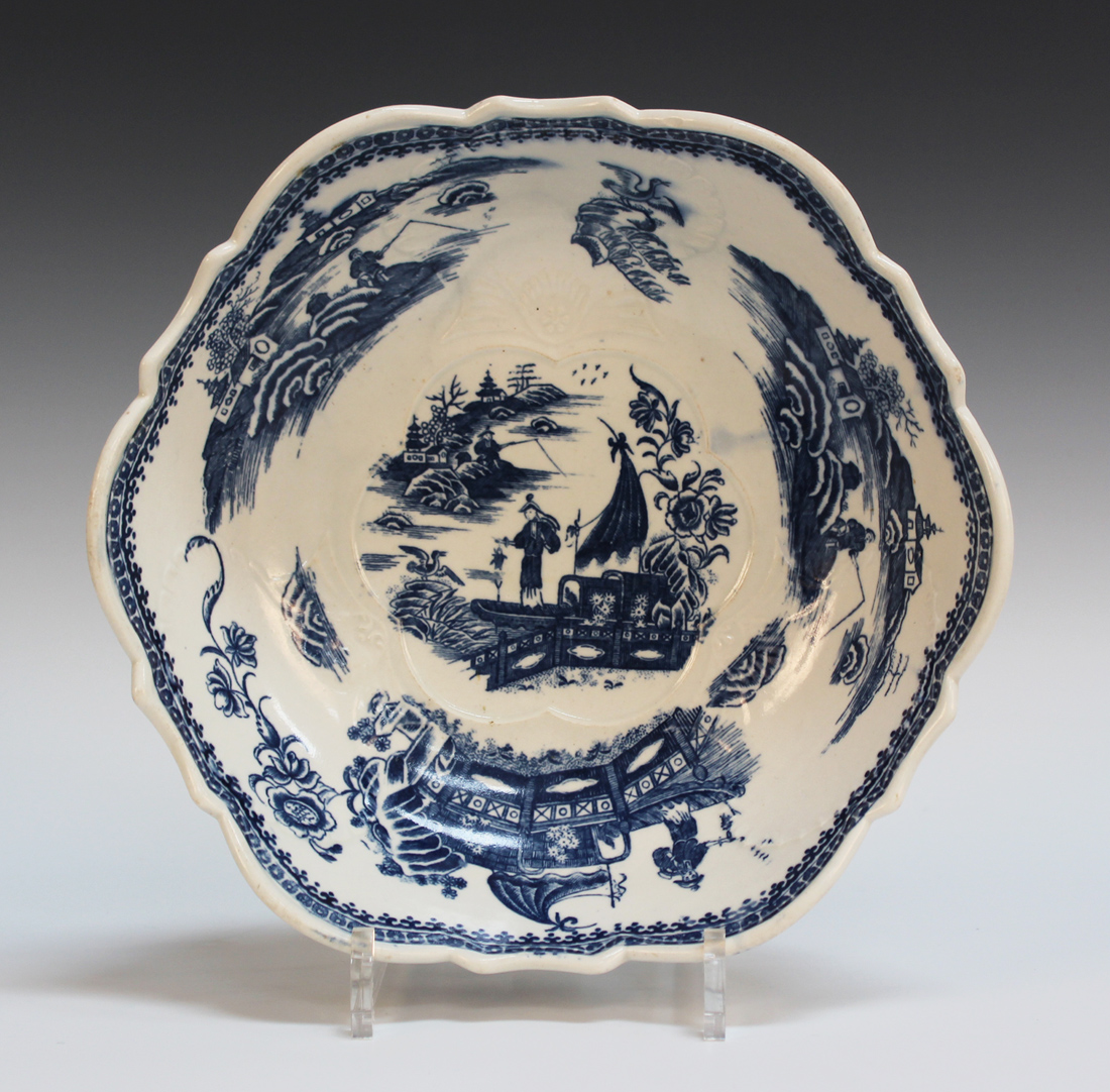 A Caughley blue and white Fisherman pattern circular porcelain salad bowl, circa 1780, with shaped rim and moulded with radiating scallop shells, printed in underglaze blue to inside and out with the Fisherman pattern, underglaze blue 'S' mark to base, diameter approx 26cm.