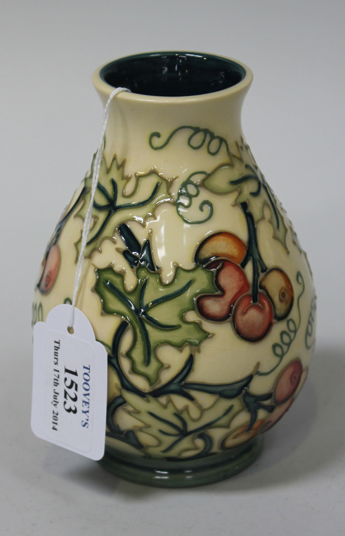 A Moorcroft pottery Bryony Special Occasions pattern vase, circa 1996, of ovoid form with narrow neck, painted and impressed factory marks with gilt painted signature 'J. Moorcroft' and dated '16.5.96' to base, height approx 13.5cm, boxed.