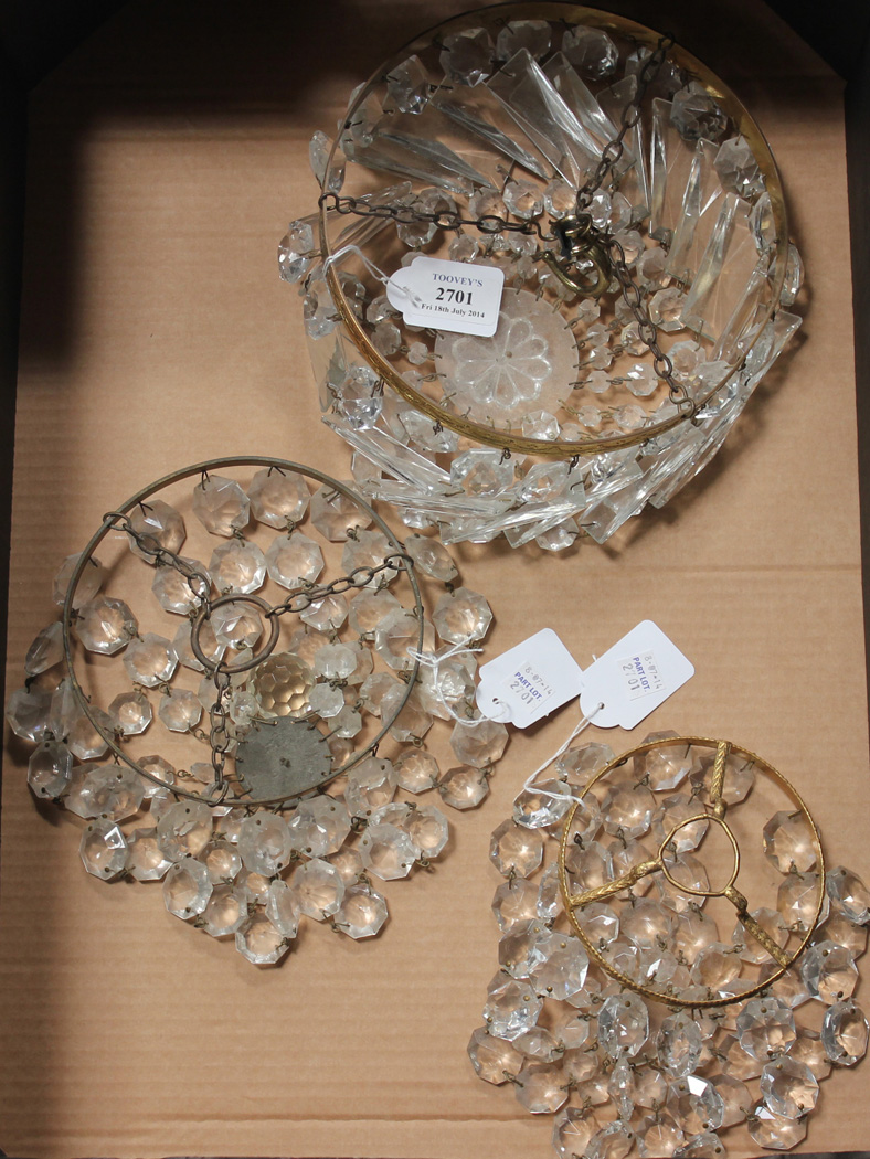A 20th Century gilt brass and cut glass circlet bag ceiling light, together with two smaller lights.
