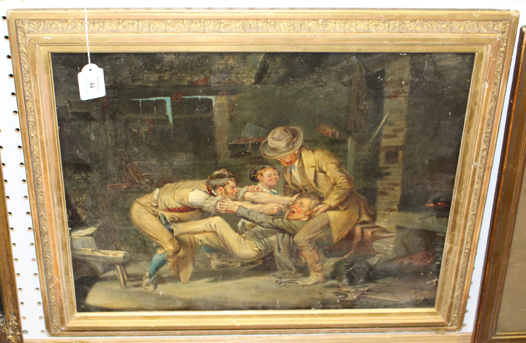 Late 19th/early 20th Century British School - Blacksmith performing Dentistry, oil on board, approx 40cm x 52cm, within a gilt composition frame.