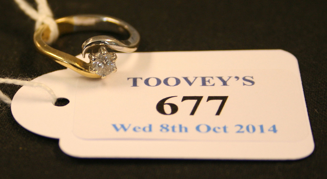 A two colour gold and diamond single stone ring, claw set with a circular cut diamond in a twist-over design, detailed '750 0.25'.