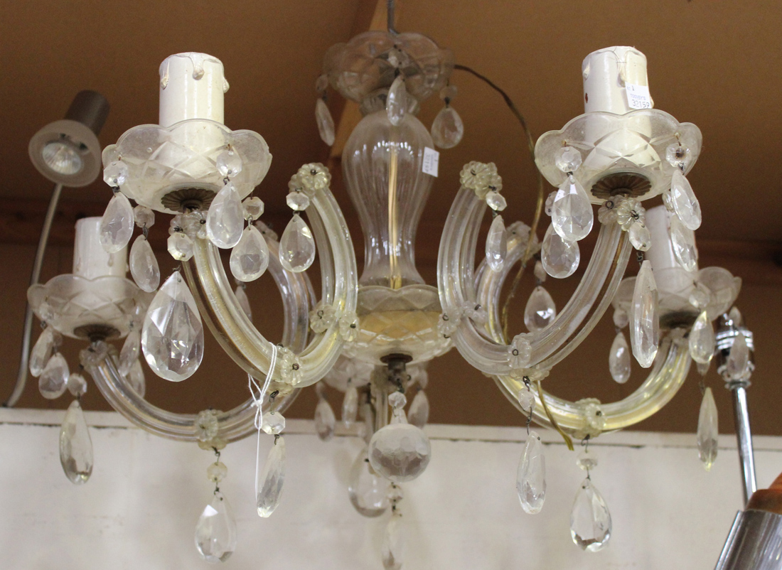 A 20th Century moulded glass five branch ceiling light, hung with lozenge drops, height approx 36cm, width approx 50cm.