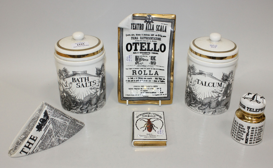 A group of Fornasetti porcelain wares, comprising a storage jar and cover inscribed 'Bath Salts', another storage jar and cover inscribed 'Talcum', an Othello poster ashtray, a paperweight in the form of a folded newspaper hat, a paperweight in the form of a book 'Le Chasseur d'Insectes' and a Nato Alphabet decorated electrical insulator model, black printed factory marks to bases.