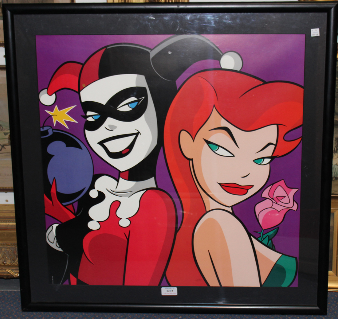 WARNER BROS. A colour print titled 'Harley Quinn and Poison Ivy' produced in a limited edition, this number 63 of 100, 60cm x 61cm, within an ebonized frame.