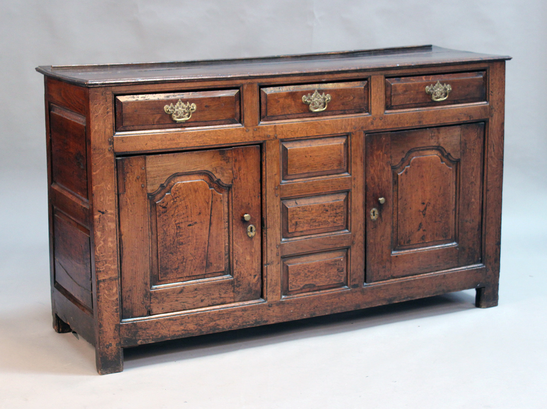 A mid-18th Century oak dresser base, the moulded top above three drawers and a pair of panelled doors flanking three moulded panels, on stile supports, height approx 90cm, width approx 156cm, depth approx 50cm.